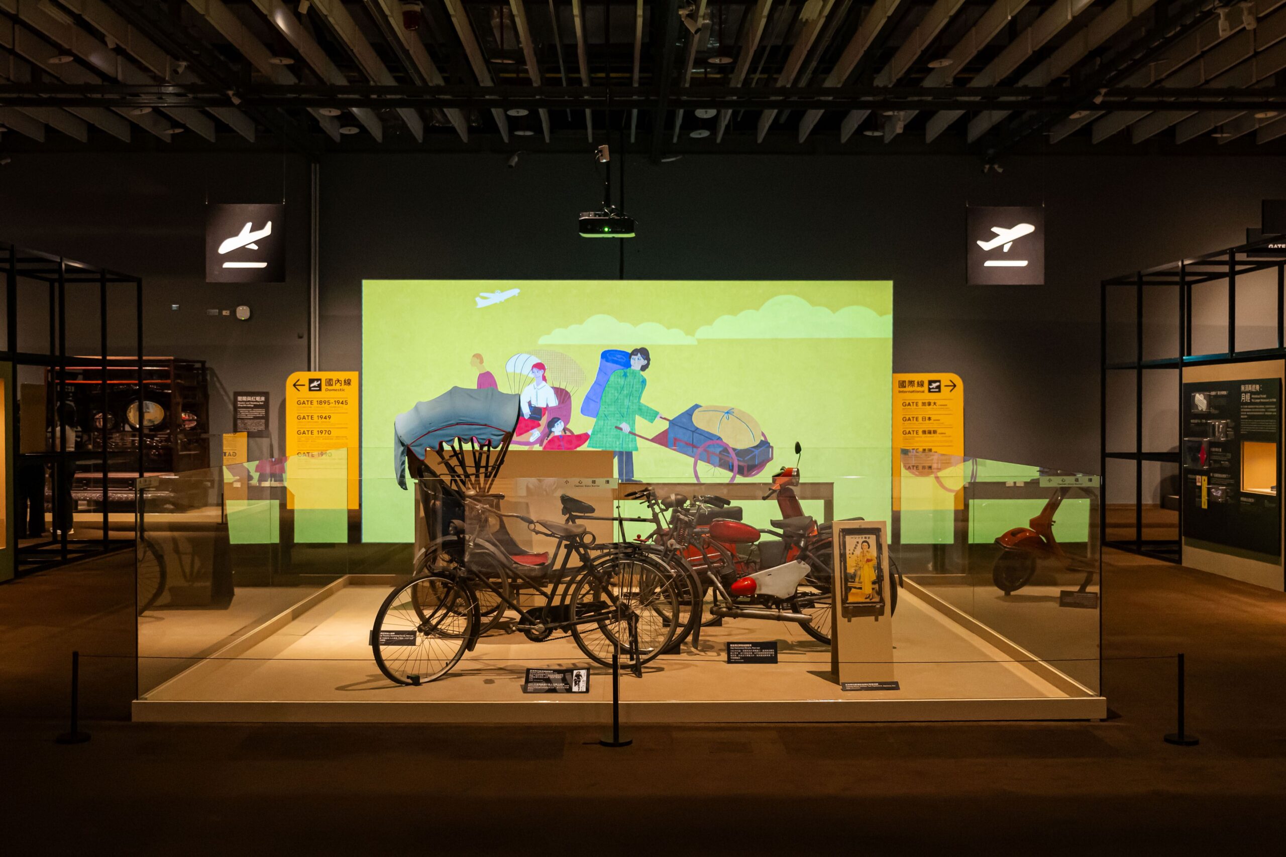 跨越地平線(情境動畫):此動畫位於大型實體展品後方,模擬了機場繁忙交織的氛圍。透過剪影與動態效果營造出時光流逝與人群穿梭的意象,進而強化了展場中「國內與國際」登機門的空間佈局。
